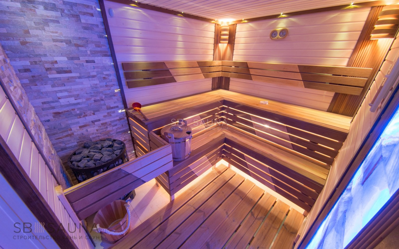 Обратите внимание как удачно сочетается отделка из липы и использование печного угла из натурального кварцита.